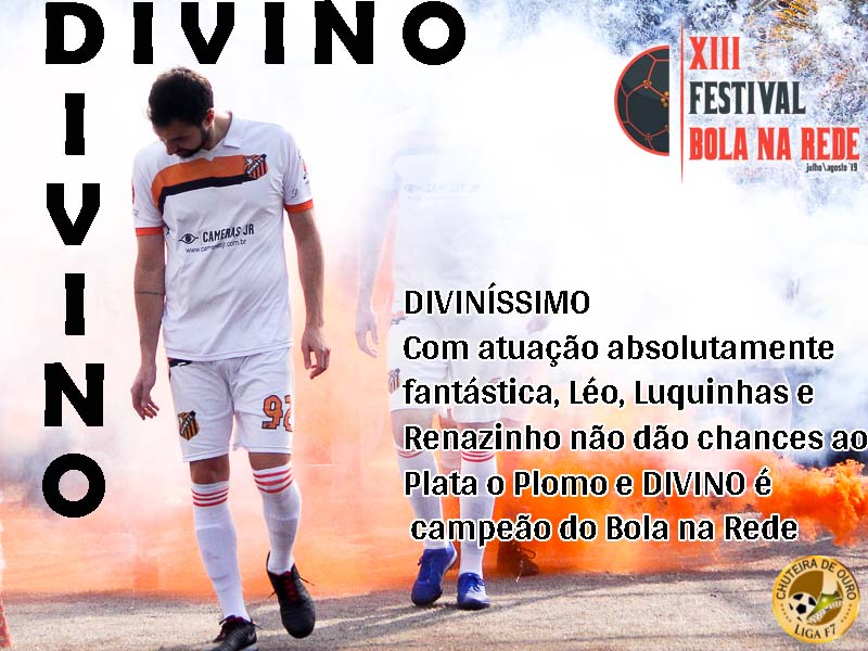 Foi mais fácil do que se podia imaginar. O Divino não tomou conhecimento do Plata o Plomo e aplicou um pneu na final da Divisão Ouro do Bola na Rede, em sua 13ª edição. O futebol eficiente do Plata visto na semifinal, quando eliminou com propriedade o favorito TeJanto por 4 x 1, não se viu na finalíssima. As ausências de Jarra e Gustavo explicam em partes o resultado acachapante de 6 x 0, mas o que complementa a justificativa é que o Divino foi mais time, tem mais qualidade individual e resolveu jogar tanto quanto na semifinal. Aí não teve jeito, né!? Lenarduci mal tocou na bola. Léo, Luquinhas e Renanzinho comandaram o ataque e, quando passou boi, passou boiada! Divino mesmo esse time!