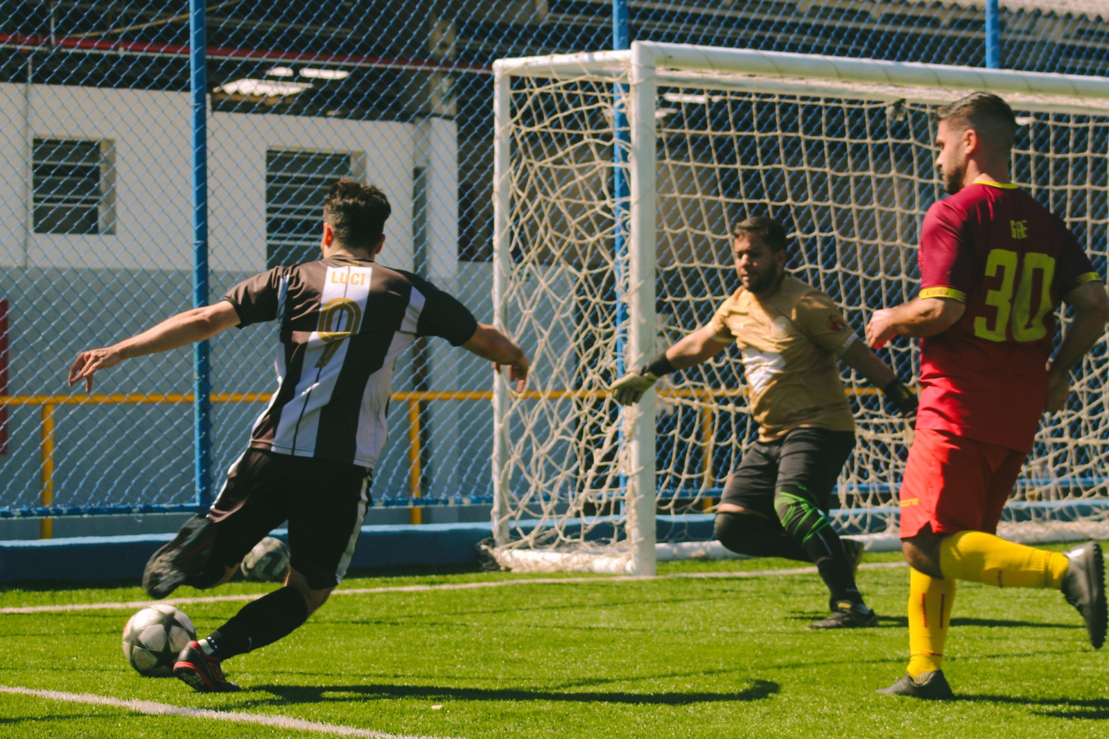 Boa parte das coisas que o Pinherol tentava dava errado. Prova disso: Felipe cobrou lateral defesa-ataque, Pires “espanou o taco”, Hugo Silva ficou com o melão pela esquerda e colocou Matheus de frente para o crime. O camisa 50 arrematou de bate-pronto e... ISOLOUUUUU!