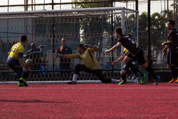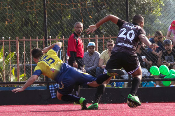 A pressão começou a resultar em chances de gol quando Andrey saiu de frente com Alan e bateu forte para ver o goleirão defender usando os pés. Mesmo com menos volume, o Mercenários ainda dava suas ciscadas, principalmente com Thiaguinho pelos lados ou Dri Ferreira em alguma jogada ocasional. No mais, o time parecia estar com um a menos em quadra, até porque alguns jogadores já haviam participado de partida prévia.