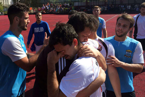 Na obrigação de arriscar, os russos foram para o tudo ou nada quando Faustinho passou a jogar como goleiro-linha. Em nova tentativa, Pipinha abriu na esquerda para Lukas, que cruzou para Marcelo cabecear para fora. Aos 25, a oportunidade de ouro para o empate dos clássicos. Faustinho mandou uma patada do meio da rua. Gamarra voou no ângulo direito e fez bela defesa. O lance prosseguiu, até que Jonny colocou a mão na bola para interceptar finalização da equipe russa. O zagueiro imperial recebeu o segundo cartão amarelo e foi expulso. Pênalti! Douglas pegou a bola, preparou-se para a batida e... isolou! Inacreditável! Pareceu o Elano!